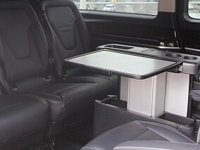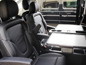 Функциональность – еще одна сильная сторона V-Class. Благодаря множеству вещевых боксов, кармашков и отсеков для мелкой поклажи проблем с размещением в дальней дороге не возникнет. Задняя часть салона снабжена комфортабельными сиденьями и столиками с множеством регулировок, благодаря которым пассажиры смогут переносить даже продолжительные путешествия. Но и передние кресла отлично подходят на все случаи жизни, одаривая анатомически выверенным профилем и выдающейся боковой поддержкой. Базовый объем багажного отделения составляет 1043 литра, однако при демонтаже задних кресел можно получить внушительные 4630 литров, которые позволят перевозить габаритный груз.